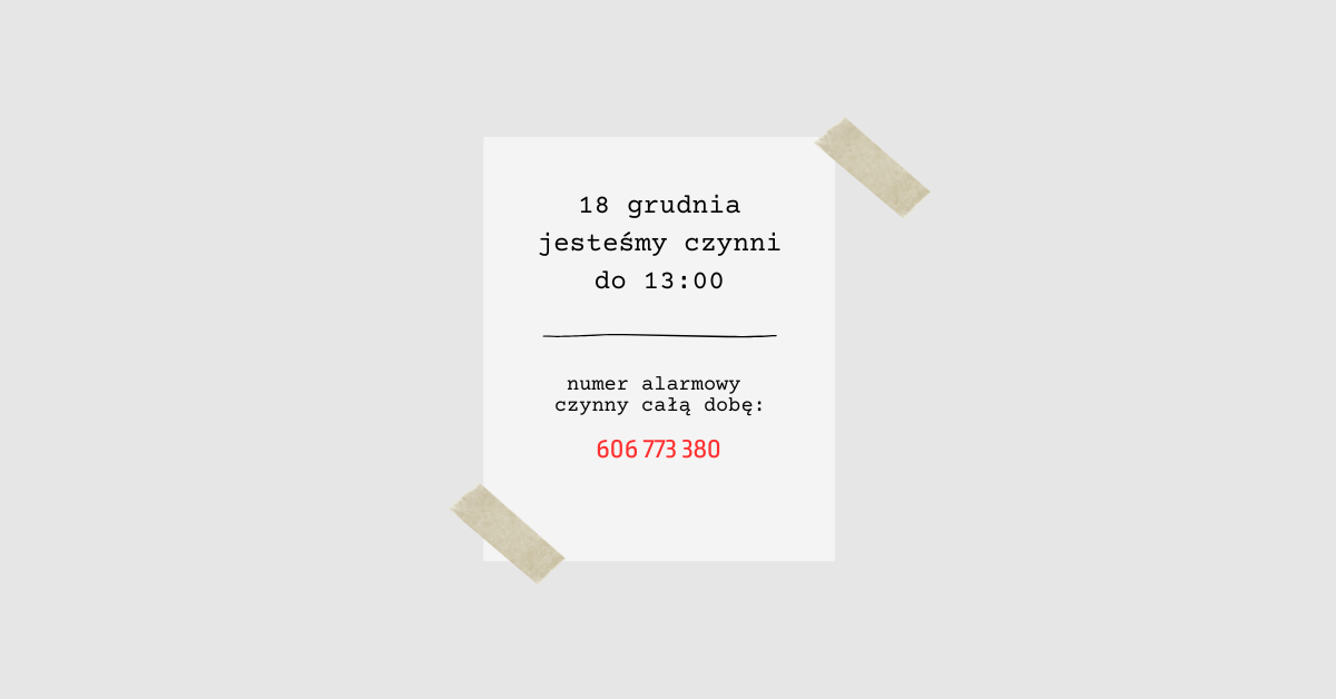 Drodzy Państwo, Uprzejmie informujemy, że jutro, tj. 18 grudnia 2025 r. nasza siedziba będzie czynna do godziny 13:00. W sprawach nagłych działa numer alarmowy, dostępny 24/7: 606 773 380. Dziękujemy za wyrozumiałość!